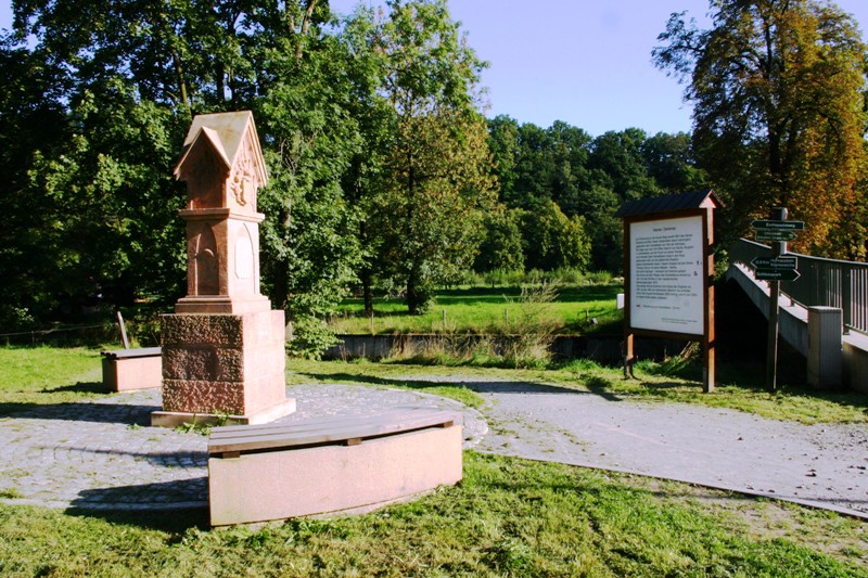 Der Majoratsherr von Lichtenwalde Friedrich II. August Graf Vitzthum von Eckstädt ließ das Harrasdenkmal aus Hilbersdorfer Porphyr, am 28. Mai 1801 auf der Mundwiese vor einem hohen Felsen des Hausteins errichten. Im Laufe der Zeit wurde es mehrfach umgestürzt und in die Zschopau geworfen. Im Jahr 1994 wurde das Denkmal durch die Dresdner Steinmetzwerkstatt Hempel aus Rochlitzer Porphyr rekonstruiert und am 29. April am angestammten Platz wieder aufgestellt. Nachdem es im August 2002 vom Hochwasser mitgerissen und in Einzelteile zerbrochen war, konnte es im April 2004 am neuen Standort "Buckelbrücke" an der Lichtenwalder Mühle wieder errichtet werden. (Quelle Ortschronik)