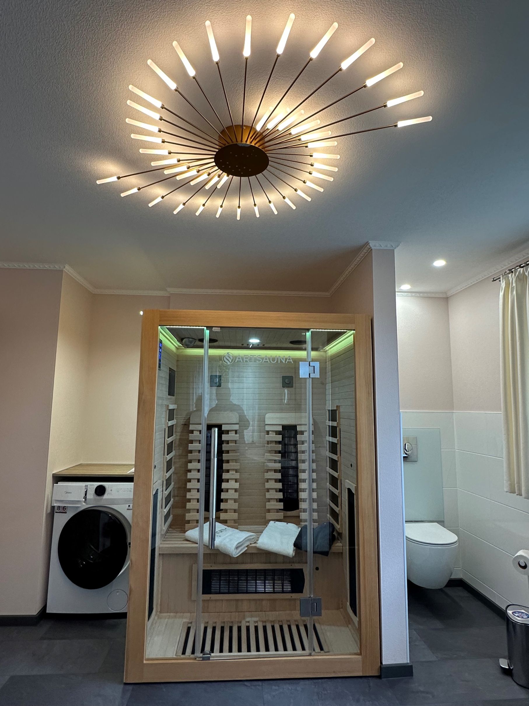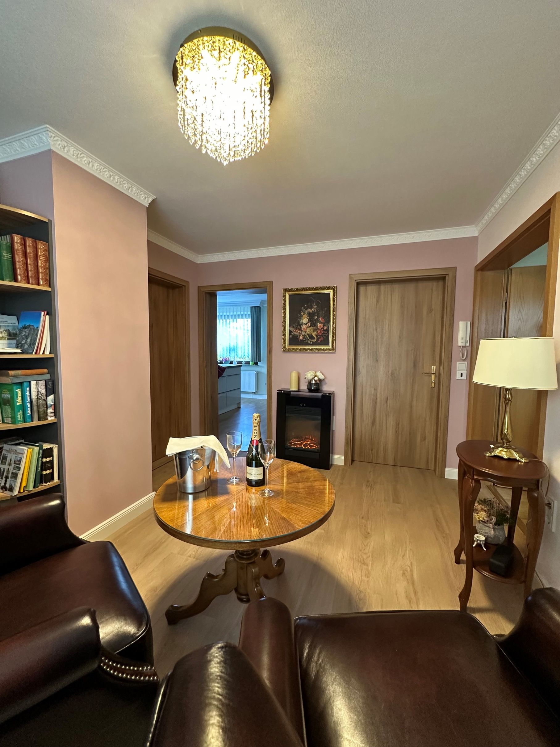 Wir bieten eine exklusive, durch den DTV zertifizierte 5- Sterne Ferienwohnung für zwei Personen. Die Ferienwohnung befindet sich im 1. Obergeschoss unseres vollständig sanierten Zweifamilienhauses, verfügt über eine Wohnfläche von 63 m² und hat vier Zimmer. Es erwartet sie unter anderem eine Wellnessoase mit Infrarot-Sauna für zwei Personen, Badewanne und bodengleiche Dusche, ein Schlafzimmer mit Boxspringbett, eine gemütliche neue Wohnküche im italienischen Stil mit TV und ein Lese-und Ruhezimmer mit Kamin. Ihnen steht ein Peloton- Fahrrad und eine Yogamatte zur privaten Verfügung.
