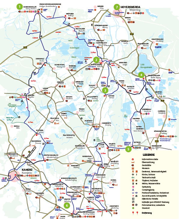 Erfahren kann man die KRABAT-Region auf dem ca. 91 km langen KRABAT-Radweg (Karte als Bild öffnen) mit Start z. B. im KRABAT-Hof (5) in Eutrich (sorbisch: Jitk). Im Buch „Meister Krabat, der gute sorbische Zauberer“ von Martin Nowak-Neumann wird berichtet, dass KRABAT als Stiefsohn eines Hirten in Eutrich nahe Königswartha aufwuchs. Er sei sehr wissbegierig gewesen, musste jedoch aufgrund der im Elternhaus bestehenden Armut schon früh zum Lebensunterhalt der Familie beitragen. Bettelnd zog er durch die Lausitz und landete dabei in der Schwarzen Mühle (1) bei Schwarzkollm (sorbisch: Čorny Chołmc), wo er neben dem Müllerhandwerk ebenso das Zaubern lernte. Auch diese wäre mit ihren sehr vielfältigen kulturellen Angeboten ein wunderschöner Startpunkt für Ihre Radtour. Die handgemalten Schautafeln entlang des KRABAT-Radwegs erzählen an zentralen Punkten spannende Episoden aus der Sage.