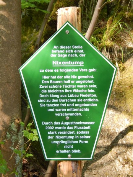 Auf der weiteren Wanderung treffen wir bald auf den Katzbach, der den Weg quert und in der Roten Weißeritz mündet und schließlich auf den Nixentump. Hier scheint das Wasser still zu stehen. Die Legende berichtet: „Hier hat der alte Nix gewohnt, den Bauern half er ungelohnt. Zwei schöne Töchter waren sein, die bleichten ihre Wäsche fein. Doch klang von Lübau Fidelton, sind zu den Burschen sie entflohn. Sie tanzten frei und ungebunden
