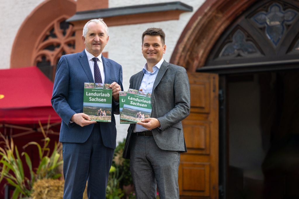 Das diesjährige 25. Sächsische Landeserntedankfest wurde am letzten Septemberwochenende in Mittweida gefeiert. 35.000 Besucher waren in der Stadt in der Mitte Sachsens zu Gast. Beim größten sächsischen Volksfest des Jahres erlebten sie ein vielfältiges Programm. Bereits am Dienstag, den 24.09.2024 wurde der Wettbewerb um die schönste Erntekrone und den schönsten Erntekranz in der Stadtkirche „Unser Lieben Frauen“ eröffnet. Im Rahmen dieser Veranstaltung wurde der neue Erlebnis- und Beherbergungsreiseführer „Mal wieder Land sehen“ Sachsen 2025 der Öffentlichkeit vorgestellt. Die ersten Exemplare wurden an den Sächsischen Staatsminister für Regionalentwicklung, Thomas Schmidt, überreicht.