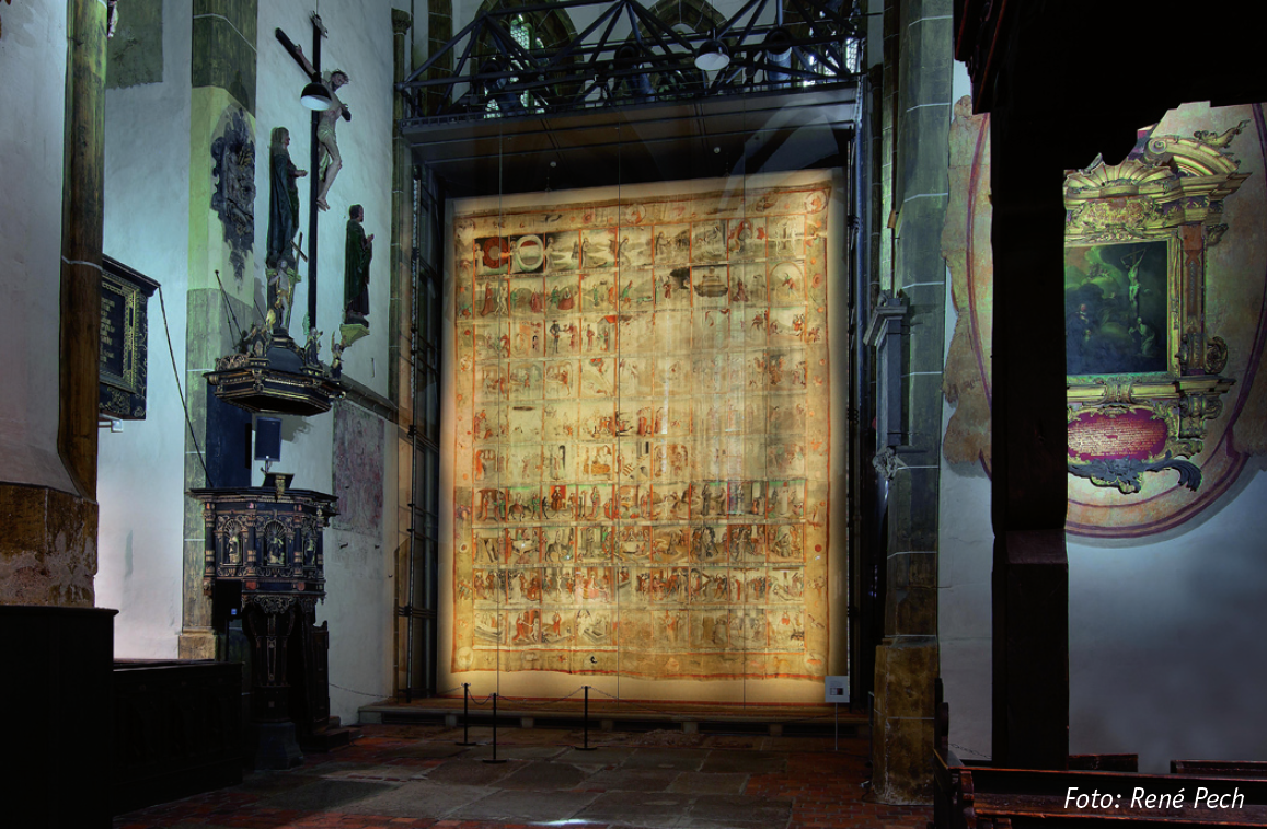Geschichten aus der Bibel. Mit 8,20 Metern Höhe und 6,80 Metern Breite gehört es zu den größten und ältesten weltweit und ist im Museum Kirche