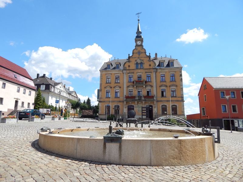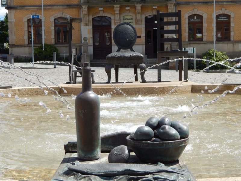 Wir beginnen unsere Tour auf den Spuren der Rabenauer Stuhlbauer im Ortszentrum auf dem Markt. Dort sehen Sie den Stuhlbrunnen. Auf dem Sandsteinsims des Brunnens sehen sie Bronzen, die das einfache Leben der Stuhlbauer symbolisieren. Die drei größten, schmückenden Elemente sind Stühle, die zusammen eine Stuhlbauerfamilie – Stuhlvater, -mutter und -kind – darstellen.