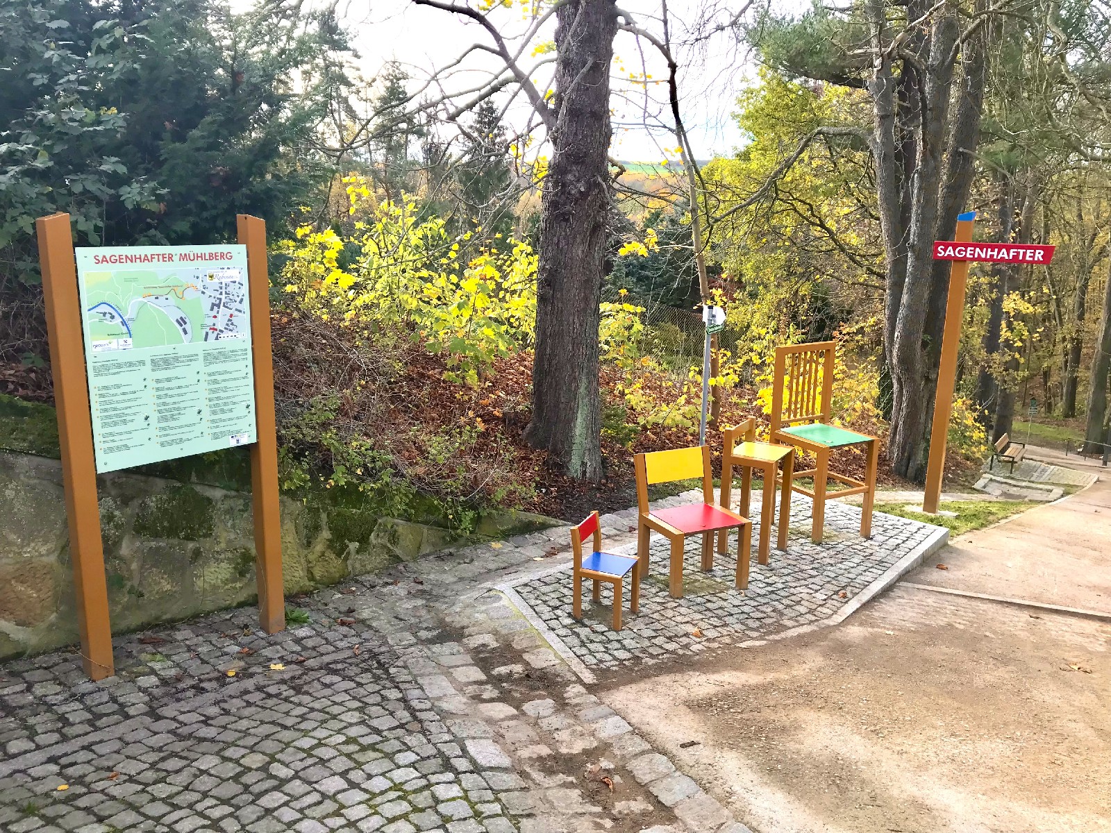 Wir beginnen die Tour auf dem Marktplatz der Stadt Rabenau und folgen ca. 50 m der Freitaler Straße und biegen dann in die Weststraße ein. Wir laufen ein kleines Stück bergab bis zur Freitreppe. Hier beginnt der Erlebnisweg „Sagenhafter Mühlberg“, der sich in den Grund schlängelt. Mannshohe Sagenfiguren des örtlichen Künstlers Olaf Klepzig säumen den Weg und erzählen von Sagen, Traditionen und der über 400-jährigen Stuhlbautradition der Stadt. Naturnahe Spielgeräte sorgen für Abwechslung und – wie es sich für eine Stuhlbauerstadt gehört – bieten kreative Sitzelemente Möglichkeiten um die Natur zu genießen und zu rasten. Nach 800 steilen Metern endet der Erlebnisweg und es wird der Bahnhof Rabenau erreicht. Seit 1882 hält hier Deutschlands dienstälteste, noch dampflokbetriebene Schmalspurbahn auf ihrer Fahrt vorerst zwischen Freital-Hainsberg und Kipsdorf ins Osterzgebirge.
